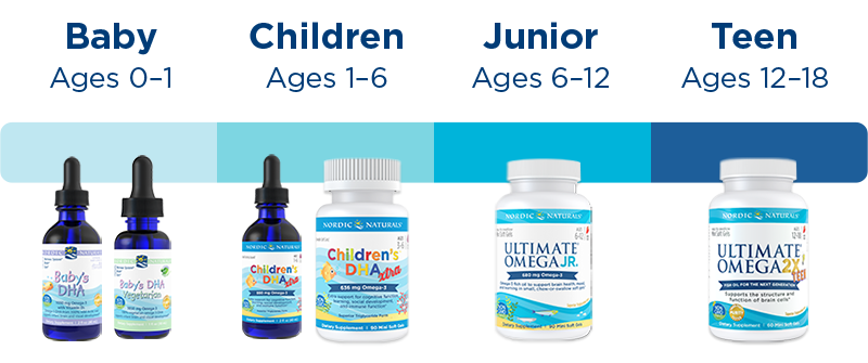 Omega-3 recommendations for infants and children vary by age and weight, but the vast majority of children do not get enough omega-3s because they do not eat enough cold-water fish. Nursing also affects babies’ omega-3 status, as nursing delivers much of mum’s omega-3s to her child. In early childhood, DHA is particularly important because the brain relies heavily on DHA for growth and development.* From about age four up to and including adolescence, most children benefit from a higher ratio of EPA to DHA for general health.*